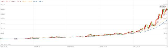 事實(shí)上,從 2000 年 6 月在美國納斯達(dá)克股票市場上市開始,網(wǎng)易股價(jià)一直處于上漲通道,在比來三年多的時(shí)間里,更是走出了一條幾乎完美的上揚(yáng)曲線,股價(jià)攀升到 300 美元以上,市值一度超 400 億美元,在 17 年來,股價(jià)暴漲了 2600 倍,成為了當(dāng)之無愧的“中概股第一牛股”。