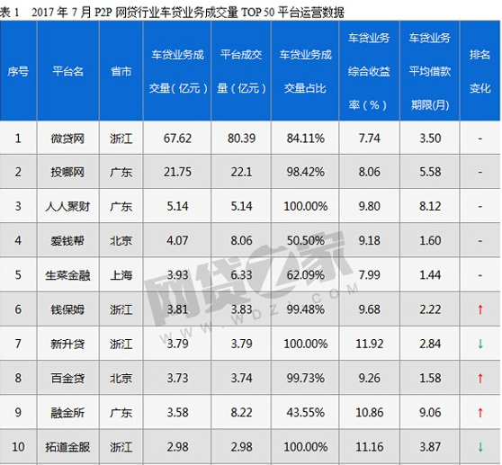 8 月 4 日,第三方網(wǎng)貸資訊平臺“網(wǎng)貸之家”發(fā)布《 7 月P2P平臺車貸業(yè)務(wù)TOP50》。此次評級以 554 家涉及車貸業(yè)務(wù)的正常運營平臺為對象,別離對車貸業(yè)務(wù)平臺的成交量作降序處理,展示了 2017 年 7 月P2P網(wǎng)貸行業(yè)車貸業(yè)務(wù)成交量TOP50 平臺排行榜(以下簡稱“排行榜”)。以車貸業(yè)務(wù)為主的P2P平臺融金所位列第九,,排名全國前十。
