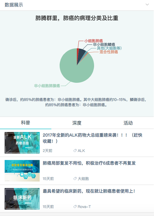 同時(shí)后臺(tái)標(biāo)簽庫(kù)有著學(xué)習(xí)功能,可隨著大數(shù)據(jù)化的內(nèi)容完善,增加、細(xì)化標(biāo)簽類別,讓文章分類更精準(zhǔn)到達(dá)所需用戶面前,降低用戶獲取信息成本,極大提升信息對(duì)于疾病的科普有效性。加上每篇文章下討論區(qū)的設(shè)置,肺騰助手中的前沿科普功能一方面將帶來(lái)社區(qū)活躍度的提升,另一方面,也給用戶帶來(lái)醫(yī)療領(lǐng)域更多維的視角和思考。