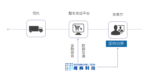 首先要對物流平臺上企業(yè)的調(diào)研,通過大量相關(guān)運營數(shù)據(jù)的分析;然后,對有資金需求的企業(yè)靈活授信,為其提供靈活、短期、高效、安適的金融辦事。如某整車貨運平臺上的發(fā)單方(小物流公司)在發(fā)出貨運需求時,需要向平臺支付相應(yīng)的費用。由于自身資金有限,常面臨有生意沒錢的困境,雁陣科技按照這些企業(yè)的特定需求,可為其配置定向白條,用于向平臺支付運費,進行短期周轉(zhuǎn)。(如下圖)