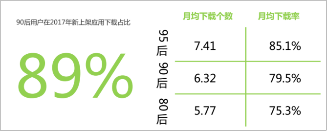而在 95 后和 90 后的比較中, 95 后月均下載個數(shù)7.41,高于 90 后月均6. 32 的下載個數(shù); 95 后85.1%的月均下載率,高于 90 后79.5%的月均下載率。