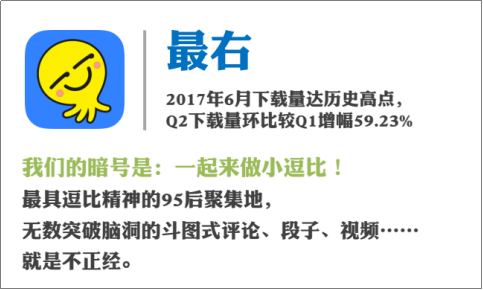 尤其在陌生人社交領(lǐng)域,從可“撩”到可“聊”,從圖文、語音、視頻社交都呈現(xiàn)了更多興趣垂直分類,比擬去年同期,用戶數(shù)均有顯著增長。以最具逗比精神的 95 后聚集地“最右”為例,特色話題趣味十足,自上線后,用戶口碑良好,被譽為APP界的《快樂大本營》,成為年輕人超愛玩的手機(jī)軟件, 2017 年 6 月下載量達(dá)到歷史高點,Q2 下載量環(huán)比較Q1 增幅59.23%,年輕人貢獻(xiàn)了大部分的下載量。