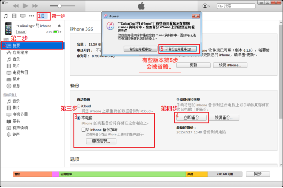 那么如何將生存微信聊天記錄的文件全部導(dǎo)出到電腦上呢?這里我們需要使用蘋(píng)果公司的iTunes辦理工具備份蘋(píng)果手機(jī)中的數(shù)據(jù)(可從蘋(píng)果網(wǎng)站免費(fèi)下載或百度“iTunes下載”獲?。?。下圖是使用iTunes備份蘋(píng)果手機(jī)數(shù)據(jù)的步驟。