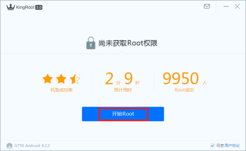 用USB數(shù)據(jù)線(xiàn)把安卓手機(jī)和電腦連接。運(yùn)行KingRoot,KingRoot將會(huì)自動(dòng)識(shí)別手機(jī)設(shè)備,,而且能夠出判斷當(dāng)前手機(jī)的Root狀態(tài),如果沒(méi)有Root過(guò),如下圖將會(huì)提示“尚未獲取Root權(quán)限”。點(diǎn)擊下圖中“開(kāi)始Root”按鈕,將會(huì)開(kāi)始Root操作了,在Root操作過(guò)程中千萬(wàn)不要拔掉USB數(shù)據(jù)線(xiàn),一般會(huì)重新啟動(dòng)手機(jī)幾次是正常的。