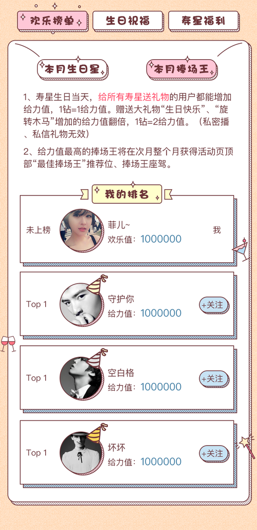 此外,每月更有歡樂榜單為壽星助興。壽星生日當(dāng)天收到的所有禮物,都能增加歡樂值。每月歡樂值最高的三名,將獲得生日星座駕 1 個(gè)月使用權(quán);同時(shí),為壽星送禮的粉絲也將增加給力值,每月給力值最高的三名,將獲 1 個(gè)月的捧場(chǎng)王座駕。