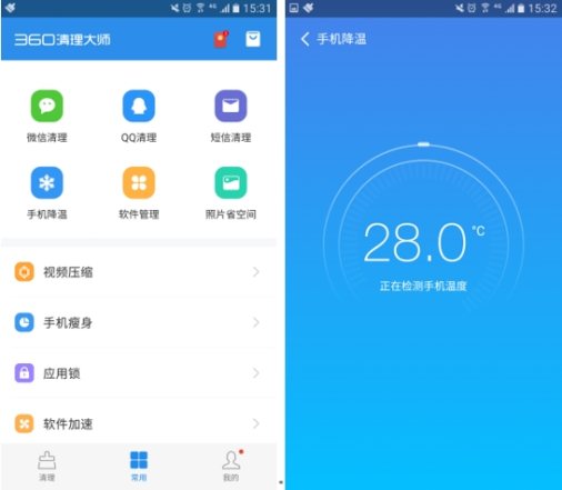 手機(jī)專家認(rèn)為,在高溫狀態(tài)下,手機(jī)整體性能將受影響,從而引發(fā)死機(jī)、重啟等問(wèn)題,甚至也帶來(lái)了安適隱患。作為讓手機(jī)連結(jié)清爽運(yùn)行的神器,360清理大師推出手機(jī)降溫功能,只需一鍵操作即可讓手機(jī)降溫好幾度,簡(jiǎn)直比空調(diào)還好用。