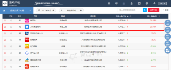 圖1 易不雅觀千帆月度TOP榜顯示 360清理大師位居優(yōu)化工具第一