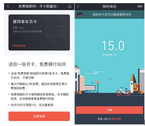 上個(gè)月 29 號(hào),摩拜單車推出了騎行月卡,每張定價(jià) 20 元,能夠享受 30 天的免費(fèi)騎行,不限騎行次數(shù)和騎行城市,同時(shí)送出了 1000 萬張免費(fèi)月卡:老用戶進(jìn)入活動(dòng)界面即可領(lǐng)取,新用戶在完成常規(guī)的實(shí)名注冊(cè)、押金繳納后,即可自動(dòng)獲得一張免費(fèi)月卡。僅僅 3 天, 1000 萬張免費(fèi)月卡就被用戶搶購(gòu)一空,隨后,摩拜再次大手筆發(fā)放 2000 萬張免費(fèi)月卡回饋用戶。