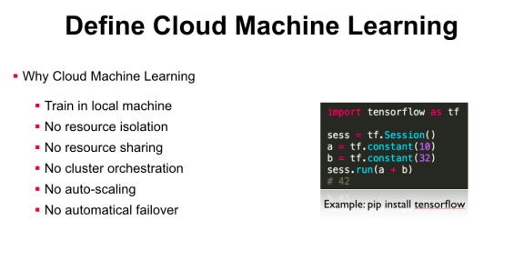 以上這些都是業(yè)界比較成熟的云深度學(xué)習(xí)平臺,而在真實(shí)的企業(yè)環(huán)境中,我們?yōu)槭裁催€需要實(shí)現(xiàn)Cloud Machine Learning辦事呢?首先國外的基礎(chǔ)設(shè)施并不必然是國內(nèi)企業(yè)可以直接使用的,而如果只是當(dāng)?shù)匕仓昧薚ensorFlow,那也只能在裸機(jī)上進(jìn)行訓(xùn)練,當(dāng)?shù)啬J(rèn)沒有資源隔離,如果同時(shí)跑兩個(gè)訓(xùn)練任務(wù)就需要本身去解決資源沖突的問題。因?yàn)闆]有資源隔離,所以也做不了資源共享,即使你有多節(jié)點(diǎn)的計(jì)算集群資源,也需要人工的約定才能保證任務(wù)不會沖突,無法充分利用資源共享帶來的便當(dāng)。此外,開源的機(jī)器學(xué)習(xí)框架沒有集群級另外編排功能,例如你想用分布式TensorFlow時(shí),需要手動(dòng)在多臺辦事器上啟動(dòng)進(jìn)程,沒有自動(dòng)的Failover和Scalling。因此,很多企業(yè)已經(jīng)有機(jī)器學(xué)習(xí)的業(yè)務(wù),但因?yàn)槿鄙貱loud Machine Learning平臺,仍會有安排、辦理、集群調(diào)度等問題。
