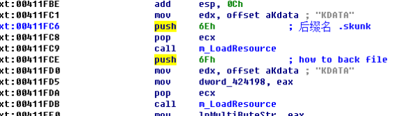 1、病毒運(yùn)行后從資源中解密出加密生成文件的后綴名,和提示文件名