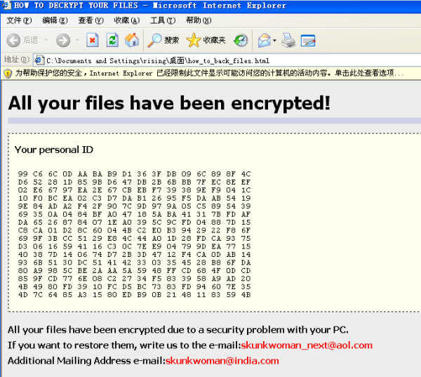 2017 年 7 月 19 日,國內(nèi)網(wǎng)友在安適論壇上反饋,本身的辦事器中了勒索病毒,所有的文件均被加密,文件后綴名被修改為“skunk”。經(jīng)瑞星安適專家調(diào)查分析發(fā)現(xiàn)是感染了Ransom.Globelmoster勒索病毒。