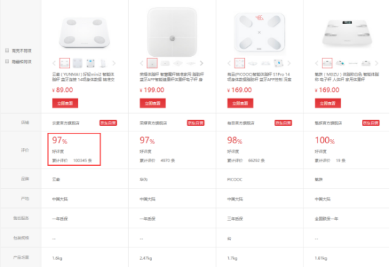 并且從功能數(shù)據(jù)方面來(lái)說(shuō),我的訴求基本只關(guān)注體重、體脂、肌肉、基礎(chǔ)代謝,其他數(shù)據(jù)就是隨便看看。就像下面列舉的思想,魅族體脂秤可以檢測(cè)12項(xiàng)身體數(shù)據(jù)、云麥好輕mini2可以檢測(cè)14項(xiàng)身體數(shù)據(jù),華為榮耀體重秤可以檢測(cè)11項(xiàng)身體數(shù)據(jù),有品體脂秤可以檢測(cè)14項(xiàng)身體數(shù)據(jù);這些主流的智能體脂秤檢測(cè)數(shù)據(jù)都是10項(xiàng)起,更多就是各家按照各家人群數(shù)據(jù)樣本而庫(kù)而宣稱的14項(xiàng)身體數(shù)據(jù)檢測(cè)了來(lái)去吸引市場(chǎng)上的用戶了。
