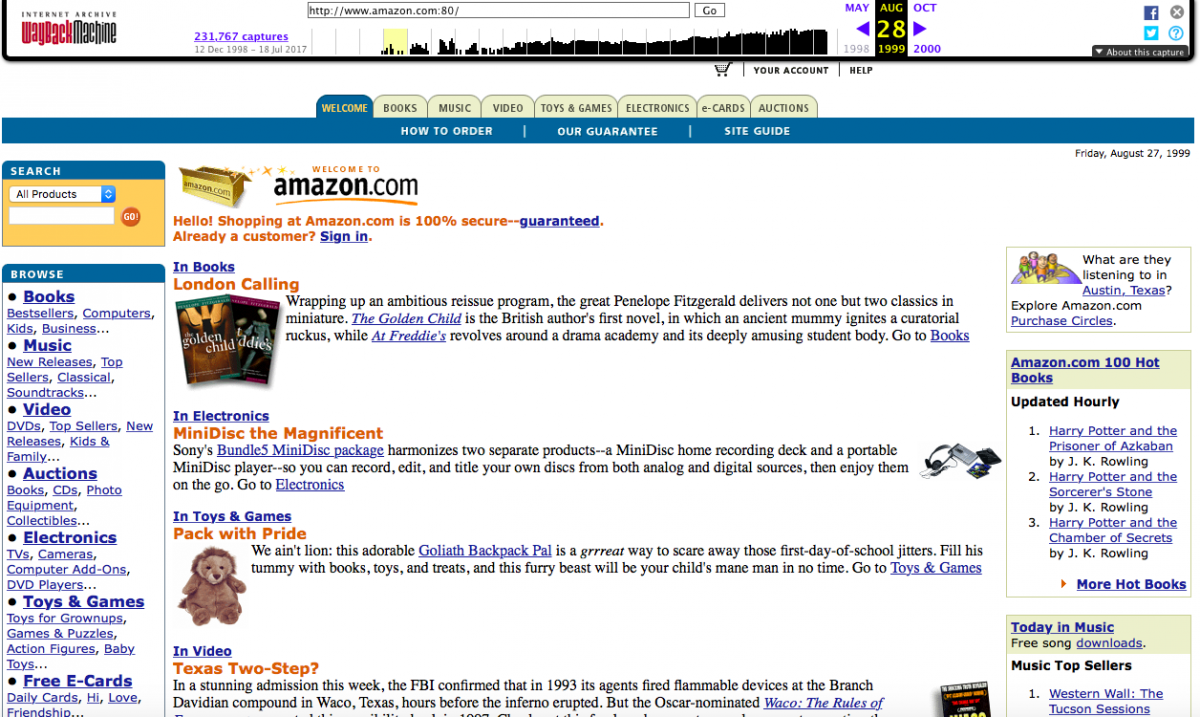 到 1999 年,也就是 Amazon 上線 4 年后,亞馬遜的官網(wǎng)上早已不再局限于“賣書”了,業(yè)務(wù)擴(kuò)展到了音樂、視頻、電子產(chǎn)品等。
