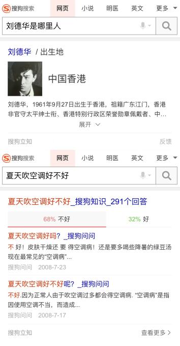 再如,針對“劉德華是哪里人”等客不雅觀事實類問題,只需要在搜索引擎的搜索框里輸入這一關(guān)鍵詞,搜狗“立知”能夠提供直接答案“中國香港”。而對于用戶經(jīng)常遇到的不雅觀點類難題,搜狗“立知”也可集中表現(xiàn)群體智慧,迅速給出網(wǎng)友不雅觀點。譬如用戶在檢索“夏天吹空調(diào)好欠好”時,搜狗“立知”即刻給出“68%的網(wǎng)友認為欠好,32%的網(wǎng)友認為好”的結(jié)果,結(jié)合來自搜狗問問的相關(guān)問答,供用戶參考。