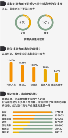 不但如此,中國父母為了孩子高考會犧牲更多的個(gè)人時(shí)間。面對高考,就近租房成為眾多家長的選擇,這也拉高了學(xué)校周邊的租房價(jià)格,成為整個(gè)高考產(chǎn)業(yè)鏈里的重要一環(huán)。其次是接送、全職陪讀,也有部分父母選擇送飯、住酒店、買學(xué)區(qū)房等。