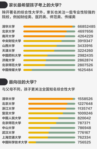高考只是戰(zhàn)斗的開始,填報(bào)志愿、選擇大學(xué)和專業(yè)才是重頭戲。對于家長,在綜合性大學(xué)之外,他們很關(guān)注一些專業(yè)性強(qiáng)校,如中央財(cái)經(jīng)大學(xué)、中國藥科大學(xué)、中國傳媒大學(xué)等;而對于考生來說,他們關(guān)注的高校基本是知名綜合性大學(xué),如浙江大學(xué)、復(fù)旦大學(xué)等。值得一提的是,清華北大在兩個(gè)“派系”中獨(dú)占鰲頭,受到父母和孩子的共同關(guān)注。