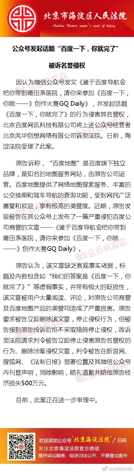 巨人網(wǎng)絡(luò)通訊聲明:本文標(biāo)題《微信公眾號發(fā)起話題“百度一下,你就完了” 百度怒上訴索賠500萬》,本文關(guān)鍵詞 微信,公眾,號,發(fā)起,話題,;如發(fā)現(xiàn)本文內(nèi)容存在版權(quán)問題,煩請?zhí)峁┫嚓P(guān)信息告之我們,我們將及時(shí)溝通與處理。本站內(nèi)容系統(tǒng)采集于網(wǎng)絡(luò),涉及言論、版權(quán)與本站無關(guān)。