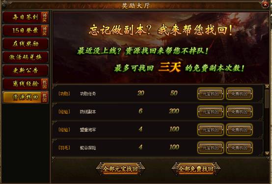 忙工作沒時(shí)間玩游戲,除了領(lǐng)取離線經(jīng)驗(yàn)值外,還可以通過資源找回來收割游戲中的獎(jiǎng)勵(lì)。官方說了,最多可找回三天的免費(fèi)副本次數(shù),一個(gè)令普通玩家振奮的消息。傲天攻沙加強(qiáng)版小伙伴可以選擇全部免費(fèi)找回,也可以選擇全部元寶找回,關(guān)鍵看口袋的元寶多與少,是否劃算。
