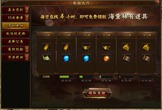 江湖盛傳“每日在線 4 小時(shí),即可免費(fèi)領(lǐng)取海量稀有道具”,這下總算是找到了組織了。在線 5 分鐘、 10 分鐘、 30 分鐘、 60 分鐘、 120 分鐘、 240 分鐘,都有著各種金條和丹藥、材料等獎(jiǎng)勵(lì)??粗逊e如山的金條,小編早已抑制不住內(nèi)心的小激動(dòng),,即即是掛機(jī)也要拿到它。激活碼兌換在此就不久不多說了,去傲天攻沙加強(qiáng)版官網(wǎng)找到激活碼,復(fù)制粘貼到兌換處,千萬別忘了這里也是一筆大獎(jiǎng)喔。攻沙加強(qiáng)版官網(wǎng)