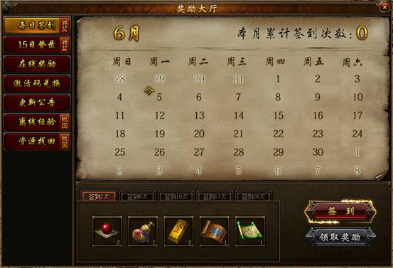 老生常談的每日簽到,管它什么獎(jiǎng)勵(lì)先領(lǐng)了再說。每天都簽一次,傲天攻沙加強(qiáng)版中后面的簽到獎(jiǎng)勵(lì)也會(huì)更多更高級(jí)。