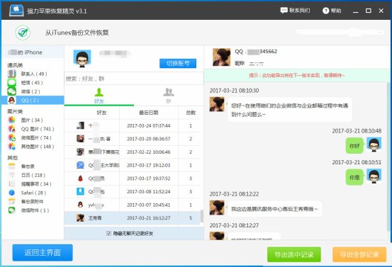 第四步:掃描結(jié)束之后,在界面左側(cè)找到“QQ”一欄點擊,旁邊出現(xiàn)有QQ賬號以及好友列表,點擊列表中任意的好友右側(cè)都顯示有對應的詳細聊天記錄,確定好需要恢復的聊天記錄之后點擊“導出選中記錄”按鈕,軟件就開始恢復工作了。