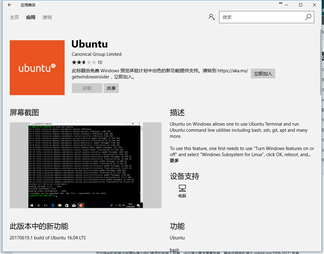 微軟應(yīng)用商店的最新版本是 Ubuntu 16.04 LTS。它支持與 Windows 10 一同以沙箱形式運(yùn)行,同時(shí)支持獨(dú)立安置常規(guī)命令行實(shí)用程序,并可通過(guò) Windows 10 進(jìn)行文件與硬件共享拜候。