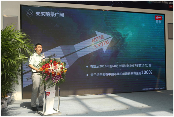 郭磊認為,憑借三大優(yōu)勢,未來量子點技術將有更廣泛的前景,按照2016年的數(shù)據(jù)顯示,量子點電視在市場的銷量是60萬臺,2017年可能會達到120萬臺,增長速度遠超乎想象。他認為,量子點技術增長幅度還有較大空間。