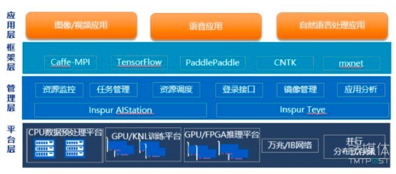 第一層次是平臺層;從整個AI計算過程的差別特點需求,我們會設(shè)計數(shù)據(jù)預(yù)處理平臺、訓(xùn)練平臺、推理平臺,采用差別的網(wǎng)絡(luò)和存儲。