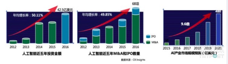 A市場正在蓬勃發(fā)展,我們從近五年人工智能的投資金額發(fā)現(xiàn)從2012年到2016年,年均增長率達(dá)到50%以上,截止到2016年,它的投資金額達(dá)到42.5億美元,AI近五年M&A和IPO的數(shù)量年均增長率為49.85%,2016年已達(dá)到68項,2020年AI整個的市場規(guī)模將達(dá)到480億美元。(數(shù)據(jù)來源:CB Insights)