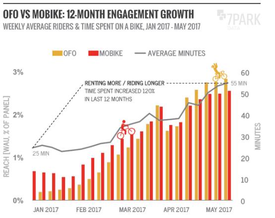 陳訴顯示,從 2016 年第四季度到 2017 年第一季度,ofo的每周活躍用戶以386%的速度呈現(xiàn)發(fā)作性增長,盡管摩拜單車也有 180%的增速,但在同一時期仍屬較慢增長。
