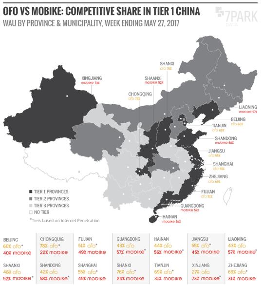 該份陳訴還公布了ofo和摩拜在中國多個省市的市場份額情況。目前 ofo的市場份額在中國 14 個一級省市中的 8 個處于領先地位,其中ofo在上海的市場份額別離為55%。