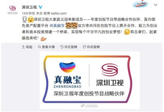 2017 年,深圳衛(wèi)視將著力打造“新聞““特色品牌綜藝”“雙創(chuàng)”“知識IP”“時(shí)尚”五大系列節(jié)目帶,聯(lián)合各方優(yōu)質(zhì)合作伙伴,通過高品質(zhì)的節(jié)目內(nèi)容合力突圍,進(jìn)一步提升影響力。據(jù)了解,真融寶已被授予深圳衛(wèi)視“年度創(chuàng)投節(jié)目戰(zhàn)略合作伙伴”稱號,雙方將在《為夢想加油》第三季、《我們的侶行》、《直播港澳臺》、《龍昂首》等知名欄目中合作,此外真融寶相關(guān)企業(yè)宣傳廣告也將在深圳衛(wèi)視《黃金劇場》中插播。