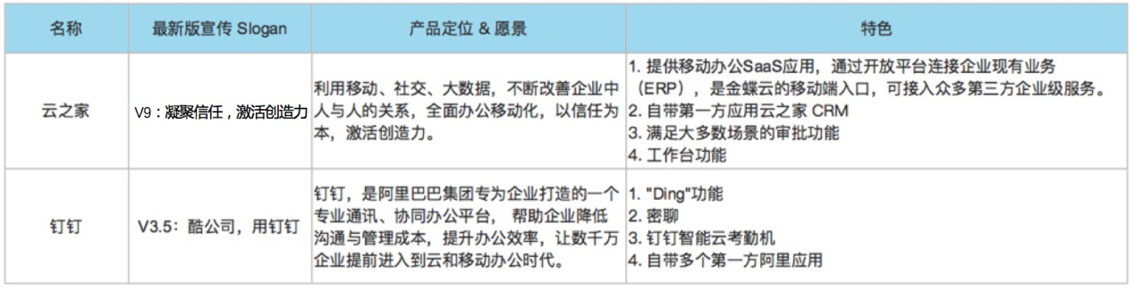 釘釘和云之家都在六月份舉辦了發(fā)布會。釘釘發(fā)布了3. 5 版本,標(biāo)語是“酷公司,用釘釘”;云之家公布了V9 版本,提出了“凝聚信任,激活創(chuàng)造力”的標(biāo)語。雙方特色總結(jié)如下: