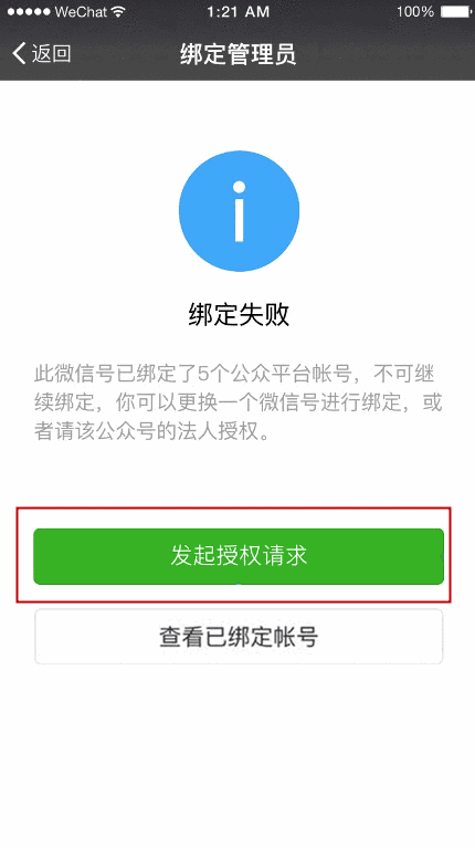 如果辦理員綁定的公眾號(hào)達(dá)到 50 個(gè),即不能再添加公眾號(hào)。