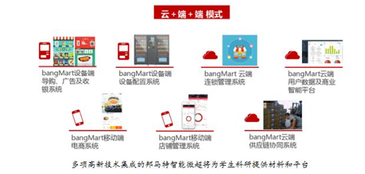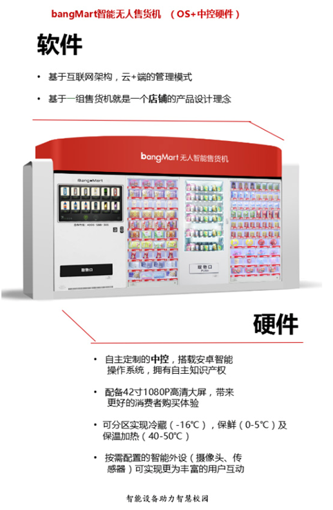 本項目以邦馬特為提供校園零售辦事的智能自動售貨機為載體,為各大高校提供“互聯(lián)網(wǎng)+零售”的智慧校園整體解決方案。這個項目將發(fā)揮兩大作用: