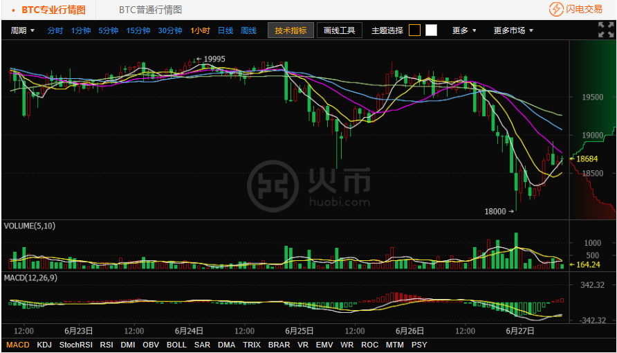看火幣網(wǎng)比特幣行情日線圖。受多日橫盤影響, 20000 元關(guān)口多次上探均沒能有效突破,最終昨日放量選擇標的目的向下,短期呈現(xiàn)空頭趨勢??椿饚啪W(wǎng)比特幣行情小時圖。昨日 23 時,火幣網(wǎng)比特幣價格最低跌至 18000 元,該關(guān)口是投資者的心里支撐位,因此接觸該位置后立即出現(xiàn)有效的反彈,后在 19000 元壓力位結(jié)束階段性的反彈,此后火幣網(wǎng)比特幣價格在18000- 19000 元區(qū)間震蕩為主?;饚啪W(wǎng)溫馨提示:投資有風險,入市需謹慎。