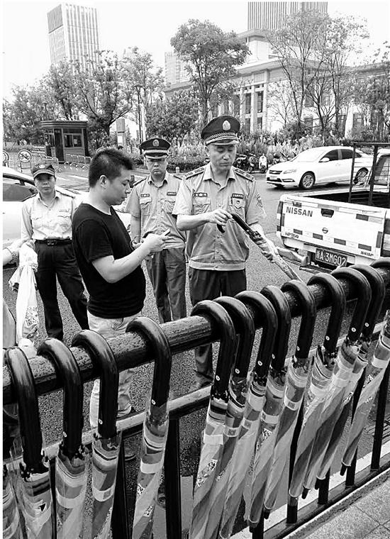 22日下午3點擺布,天水中隊集中對轄區(qū)內(nèi)的共享雨傘進行了集中清理整改。天水執(zhí)法中隊中隊長陳敏奇告訴錢江晚報記者,共享雨傘在戶外公共區(qū)域投放時,存在占用公共設(shè)施的情況。
