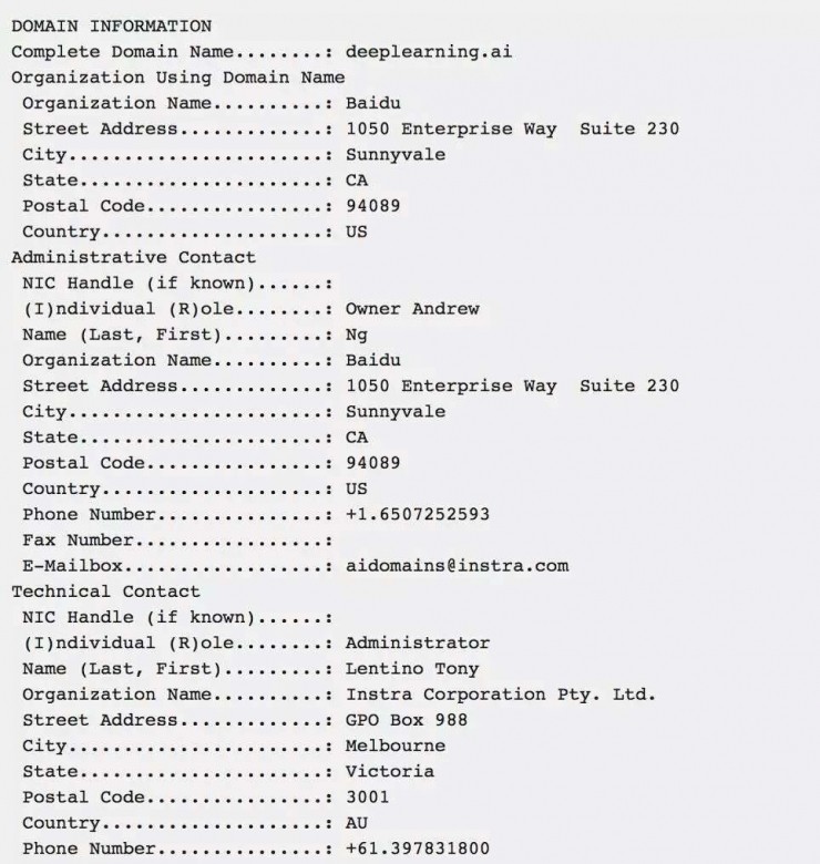 有媒體發(fā)現(xiàn)Deeplearning.ai的域名似乎已注冊到百度位于硅谷森尼韋爾的研發(fā)機(jī)構(gòu),也是吳恩達(dá)此前工作過的相同的辦公室。按照從Wayback Machine上獲取的數(shù)據(jù),該域名由Instra注冊,并于2015-2017年之間被認(rèn)領(lǐng)。