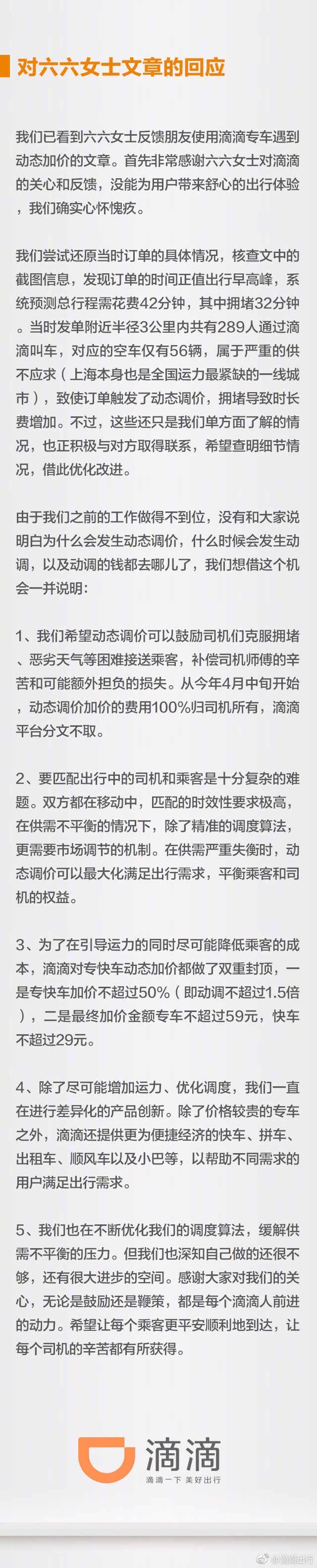 對此,滴滴出行官方發(fā)布了一篇長文《對六六女士文章的回應(yīng)》,針對當(dāng)時(shí)的訂單進(jìn)行了核查,體現(xiàn)當(dāng)時(shí)的情況屬于嚴(yán)重的供不該求,致使訂單觸發(fā)了動(dòng)態(tài)調(diào)價(jià),擁堵導(dǎo)致時(shí)長費(fèi)增加。同時(shí)也正積極與對方取得聯(lián)系,希望查明細(xì)節(jié)情況,借此優(yōu)化改進(jìn)。