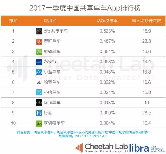 近日,中國最具全球視野的移動數(shù)據(jù)研究機(jī)構(gòu)Cheetah Lab(獵豹全球智庫)最新發(fā)布了"中國共享單車App排行榜",數(shù)據(jù)顯示ofo最新活躍滲透率為1.002%,居共享單車行業(yè)榜首;緊跟其后的摩拜單車活躍滲透率為0.713%; ofo活躍滲透率明顯占優(yōu),是摩拜的1. 4 倍。