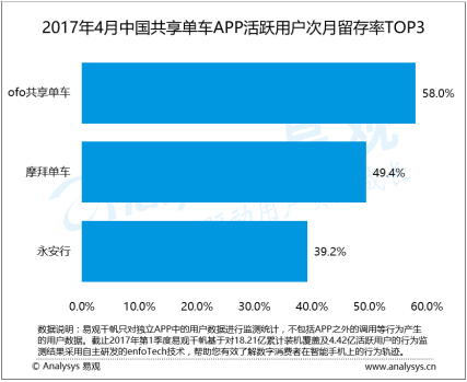 實際上,ofo小黃車一直以用戶體驗至上,為用戶提供最好的辦事,這也使ofo用戶粘性很高。按照第三方權(quán)威數(shù)據(jù)機構(gòu)易不雅觀陳訴顯示,本年4月,ofo小黃車APP活躍用戶次月留存率達到58.0%,領(lǐng)先于摩拜單車和永安行,排名行業(yè)第一。