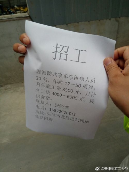 據(jù)了解,,此維修點位于天津劉園地鐵站附近,是ofo的第三方維修點,目前正在招聘共享單車維修人員。TechWeb撥打劉園維修點負(fù)責(zé)招聘的張經(jīng)理電話,目前其電話無法接通。