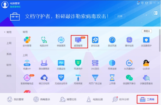 用戶下載或升級(jí)騰訊電腦管家最新版本后,在電腦管家首頁底部“工具箱”中找到“桌面整理”功能進(jìn)行下載升級(jí),升級(jí)后點(diǎn)擊右鍵即可進(jìn)行文件映射功能的操作,而文件搜索按鈕升級(jí)后會(huì)自動(dòng)在桌面生成,用戶可隨意使用。
