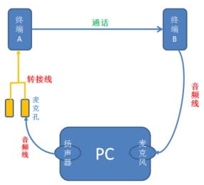 以上設(shè)備根據(jù)圖2- 1 方式連接后,在PC 上播放音頻,聲音從 PC的揚(yáng)聲器通過(guò)音頻線和轉(zhuǎn)接線傳入到主叫A的麥克里,然后主叫A中的通話軟件采集聲音并經(jīng)過(guò)網(wǎng)絡(luò)傳到被叫B,之后聲音從被叫B通過(guò)音頻線連接PC的麥克風(fēng)傳入到PC上,在PC上進(jìn)行音頻錄制操作。這里需要注意的是,由于主叫和被叫都有麥克風(fēng)權(quán)限,為了保證測(cè)試過(guò)程中數(shù)據(jù)的準(zhǔn)確性,不受外界聲音的影響,連接電腦mic端的被叫B必然要連結(jié)靜音,主叫A必然要插出耳機(jī)模式。