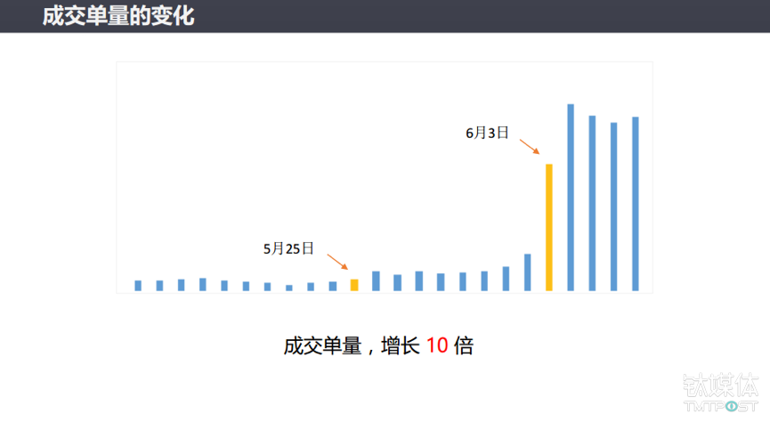 在當(dāng)天的案例演示中,劉進(jìn)提供了三張用戶活躍度表格,別離是注冊(cè)用戶量、日活躍用戶與成交單量,可以看到柱狀圖中,5 月 25 日與 6 月3 日的起伏較大。