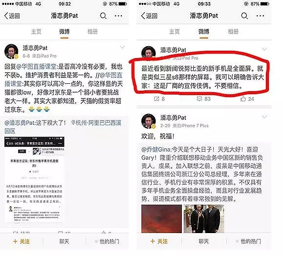 而潘志勇隨后在微博中回應(yīng)稱,“我在一個群里面說了幾句話,就被又被媒體寫我大量發(fā)京東黑稿。。。第一,我確實是天貓手機負(fù)責(zé)人,天貓手機本次618完勝,并且天貓手機天天618,這僅僅是開始;第二,我就問這些媒體報道京東的事情是不是事實嘛。你在怕什么?”。