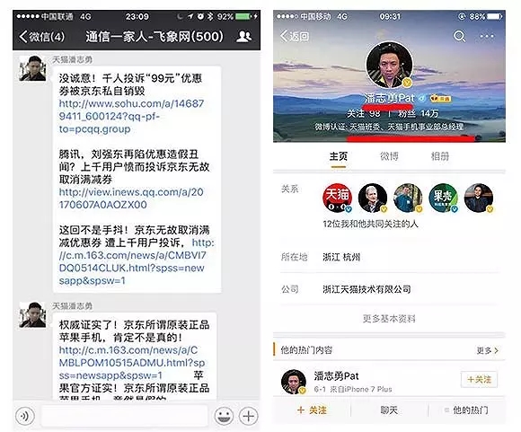早在六月初,據(jù)中國經(jīng)濟網(wǎng)消息,6月8日晚間,阿里巴巴副總裁、天貓手機負(fù)責(zé)人潘志勇在某媒體微信群中分享大量京東“黑稿”,并稱“明天還有,明天見”,讓群內(nèi)人士大跌眼鏡。