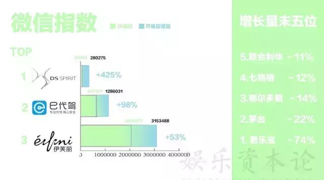 娛樂本錢論統(tǒng)計了36個植入品牌在《歡樂頌2》播出前后,百度指數(shù)、微博指數(shù)和微信推文量的變革,雖然他們并不反應(yīng)銷售額的變革,但他們在必然程度上反映了品牌植入在網(wǎng)絡(luò)上的傳播效果、話題效應(yīng)。