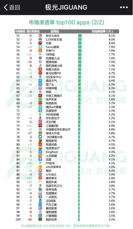 而同時(shí),在最新權(quán)威數(shù)據(jù)極光大數(shù)據(jù)發(fā)布的《 2017 年 4 月App風(fēng)云榜》顯示,在市場(chǎng)滲透率方面,ofo以高達(dá)4.04%的市場(chǎng)滲透率穩(wěn)居行業(yè)第一,摩拜單車以3.87%滲透率跟隨其后。更值得一提的是,ofo的滲透率始終連結(jié)著較快的增速,成為 4 月整個(gè)榜單中的最大黑馬;摩拜排位上升也較快,但仍落后于ofo。
