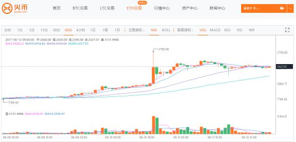 看火幣網(wǎng)以太坊行情小時(shí)圖。 6 月 9 日晚間,火幣網(wǎng)以太坊價(jià)格再次創(chuàng)出歷史新高,破前期高點(diǎn)1858. 7 元,后續(xù)連續(xù)小幅上漲,直至 6 月 10 日晚間,火幣網(wǎng)以太坊價(jià)格突然爆量上漲,一小時(shí)內(nèi)從 2000 元天量漲至 2700 元,漲幅一度超過30%。后因投資者多空不合,回落至 2400 元附近,放量創(chuàng)出短期高點(diǎn)后產(chǎn)生高位強(qiáng)壓力位?,F(xiàn)火幣網(wǎng)以太坊價(jià)格縮量高位進(jìn)行盤整,等待標(biāo)的目的選擇?;饚啪W(wǎng)溫馨提示:以太坊自本年初尚未經(jīng)歷大幅調(diào)整,敬請(qǐng)注意風(fēng)險(xiǎn)。